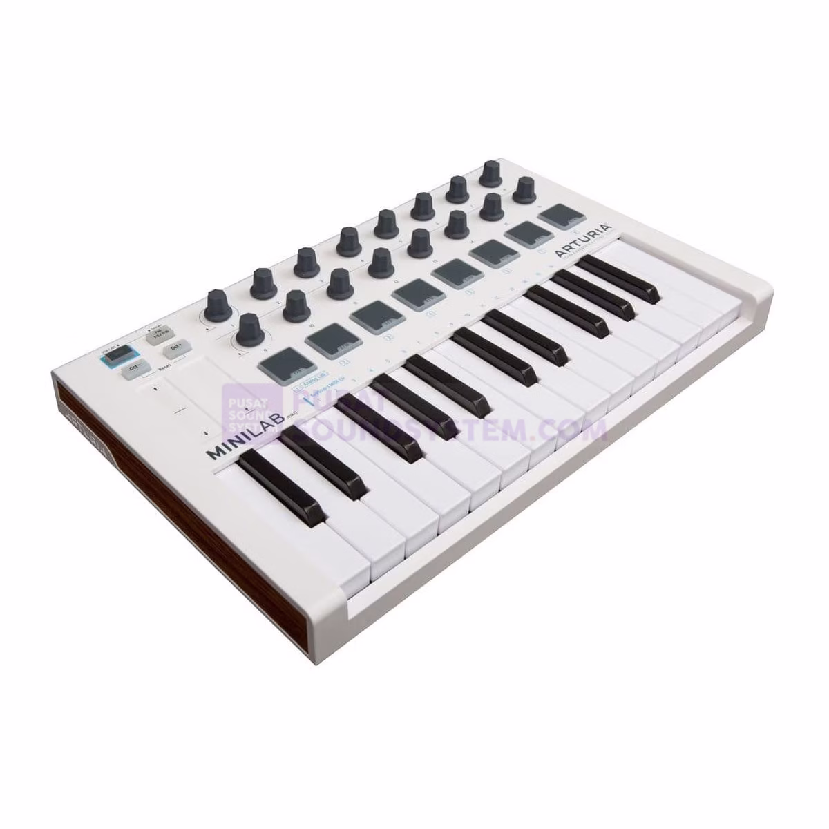 The MiniLab MkII features 25 slim-keys, 16 knobs, 8 pads and two touch controls in a space saving package. Designed for the mobile musician, the slim, compact profile makes it perfect for transporting to and from gigs and recording sessions. MiniLab MkII’s tiny profile allows you to place it virtually anywhere within your set-up.