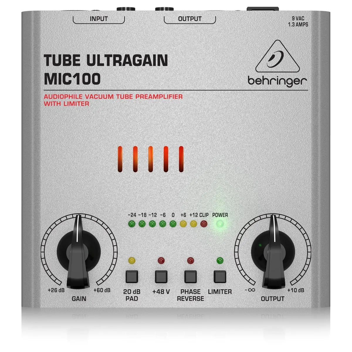 Tired of stale, brittle, digital-sounding recordings? Warm up your recordings with the Behringer Tube Ultragain MIC100 preamp. The Tube Ultragain MIC100 features a hand-selected 12AX7 tube that imparts warmth to your signal, while phantom power and the onboard 20dB pad ensures compatibility with any mic in your locker. A top-panel LED meter is provided for accurate level monitoring. You can also use the MIC100 as a direct box for guitars, basses or keyboards.