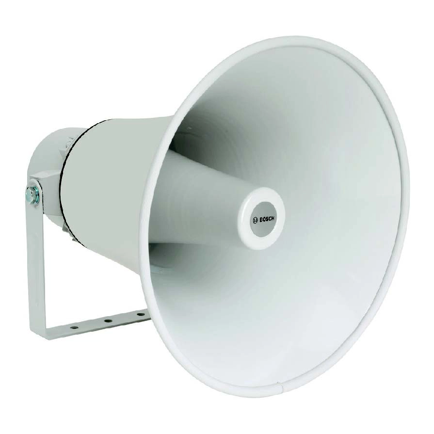 Bosch high-efficiency horn loudspeakers provide excellent speech reproduction and sound distribution for a wide scope of outdoor applications. They are ideal for sports grounds, parks, exhibitions, factories and swimming pools. The LBC 3482/00 is a circular 25 W horn loudspeaker, measuring 355 mm (14 in) in diameter. It is made from aluminum. The edges of the horn are covered with a PVC profile for protection against impact damage. It is light gray (RAL 7035) and is water and dust protected. Voice alarm loudspeaker The LBC 3482/00 is designed for use in voice alarm systems and is compliant with emergency standards. The horn loudspeaker has built-in protection to ensure that, in the event of a fire, damage to the loudspeaker does not result in failure of the circuit to which it is connected. In this way, system integrity is maintained; ensuring loudspeakers in other areas can still be used to inform people of the situation. The horn loudspeaker has a ceramic terminal block, thermal fuse and heat resistant, high-temperature wiring. They have provision for inside mounting the optional line/loudspeaker supervision boards.
