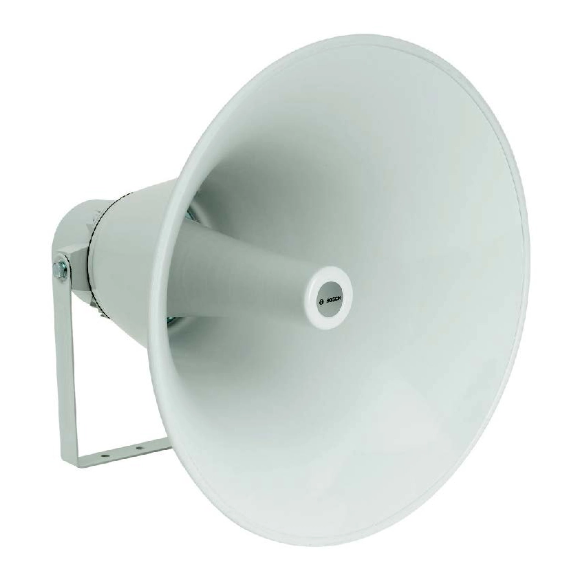 Bosch high-efficiency horn loudspeakers provide excellent speech reproduction and sound distribution for a wide scope of outdoor applications. They are ideal for sports grounds, parks, exhibitions, factories and swimming pools. The LBC 3483/00 is a circular, 35 W horn loudspeaker, measuring 490 mm (19.6 in) in diameter. It is made from aluminum. The edges of the horn are covered with a PVC profile for protection against impact damage. It is light gray (RAL 7035), and is water and dust protected. Voice alarm loudspeaker The LBC 3483/00 is designed for use in voice alarm systems and is compliant with emergency standards. The horn loudspeaker has built-in protection to ensure that, in the event of a fire, damage to the loudspeaker does not result in failure of the circuit to which it is connected. In this way, system integrity is maintained; ensuring loudspeakers in other areas can still be used to inform people of the situation. The Horn loudspeaker has a ceramic terminal block, thermal fuse and heat resistant, high-temperature wiring. They have provision for inside mounting the optional line/loudspeaker supervision boards.
