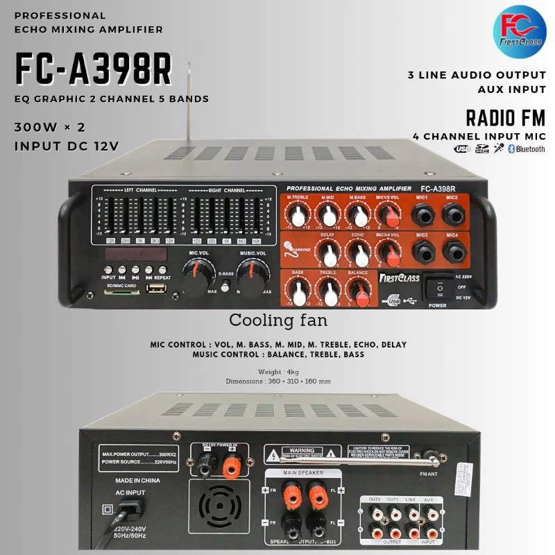 Fc – a398r amplifier dengan harga terjangkau tetapi memiliki kualitas terbaik dengan fitur sangat lengkap dan sudah di dukung dekat remote untuk mempermudah pemakaian nya.