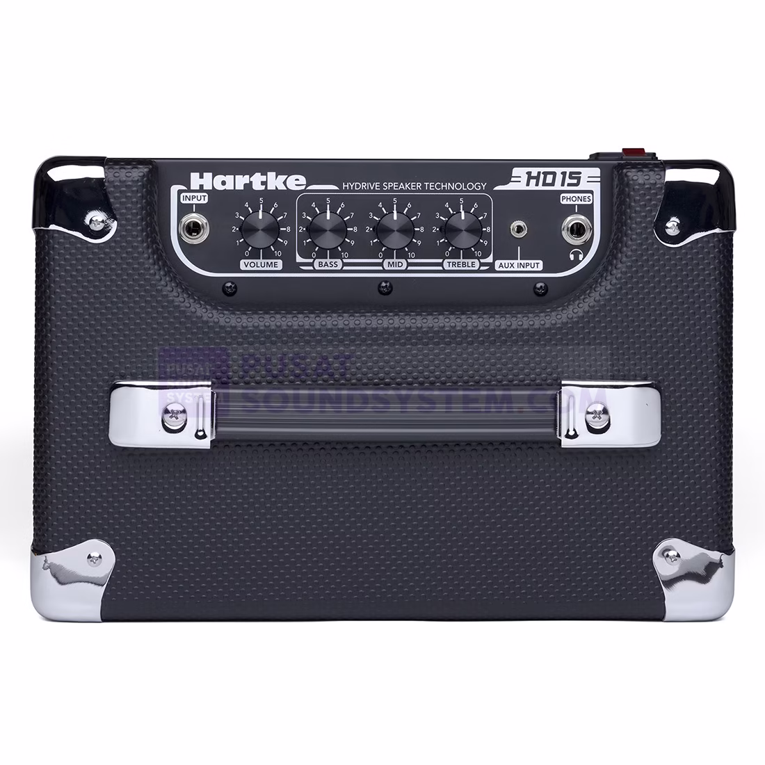 - Top-mounted amplifier with Volume, Bass, Mid and Treble controls
