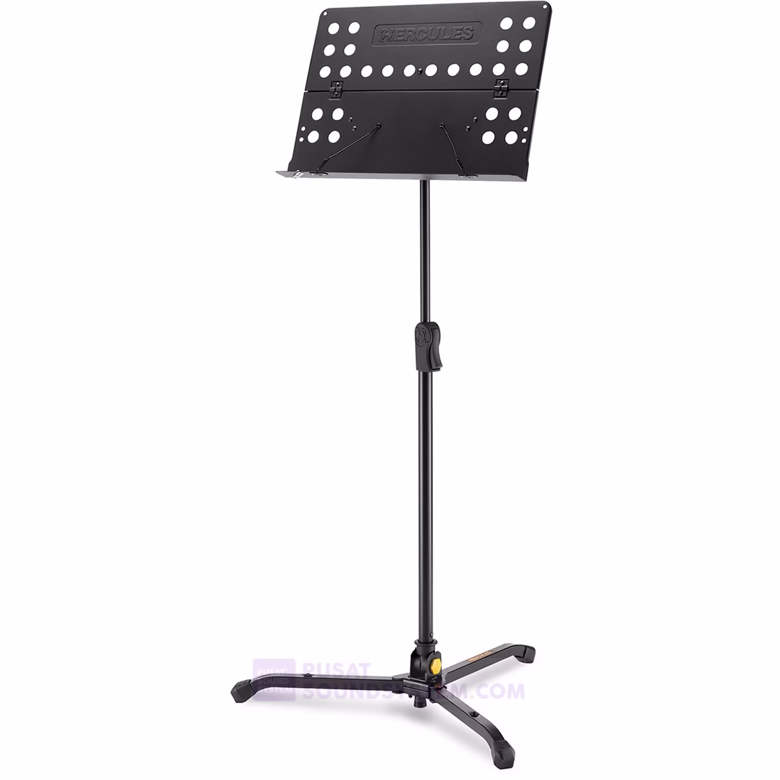The HERCULES Music Stand BS311B features the patented EZ Clutch Height Adjustment Grip, a perforated folding desk, a tiltable tripod base, open taps for instrument pegs and wire page retainers.