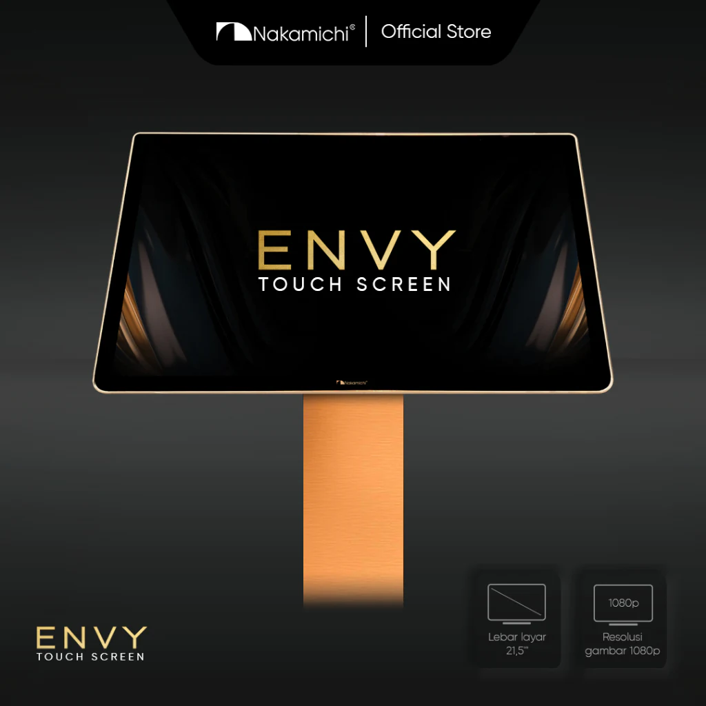 Nakamichi ENVY Touchscreen 21,5” dengan design elegant perpaduan warna gold dan hitam yang sangat mewah.