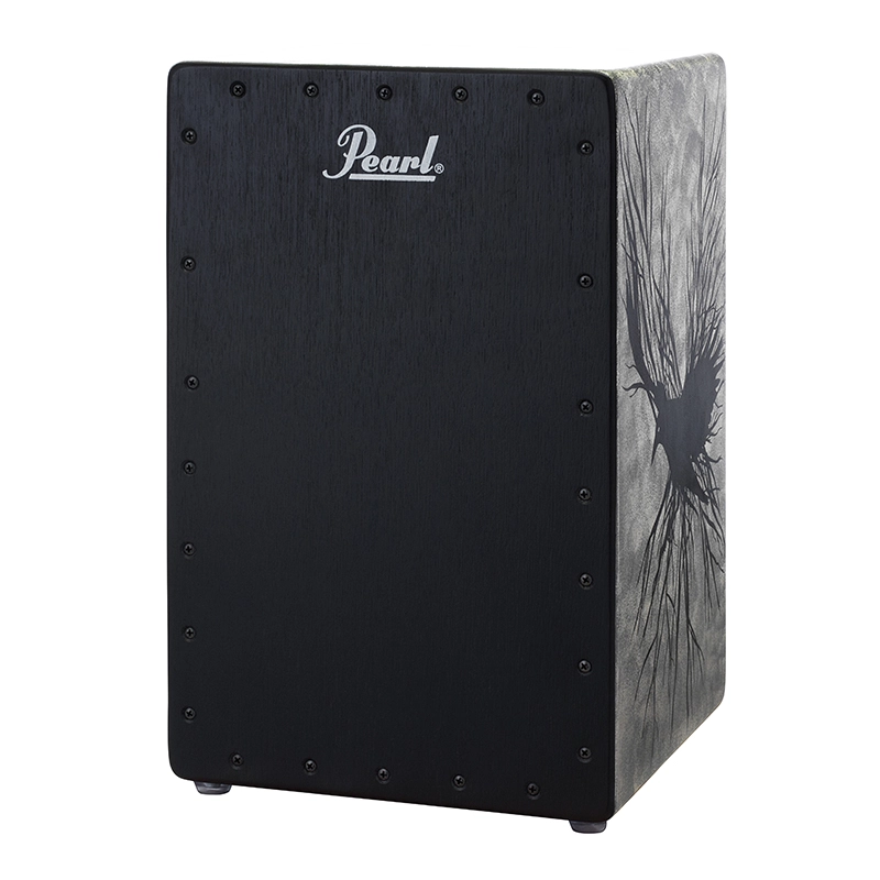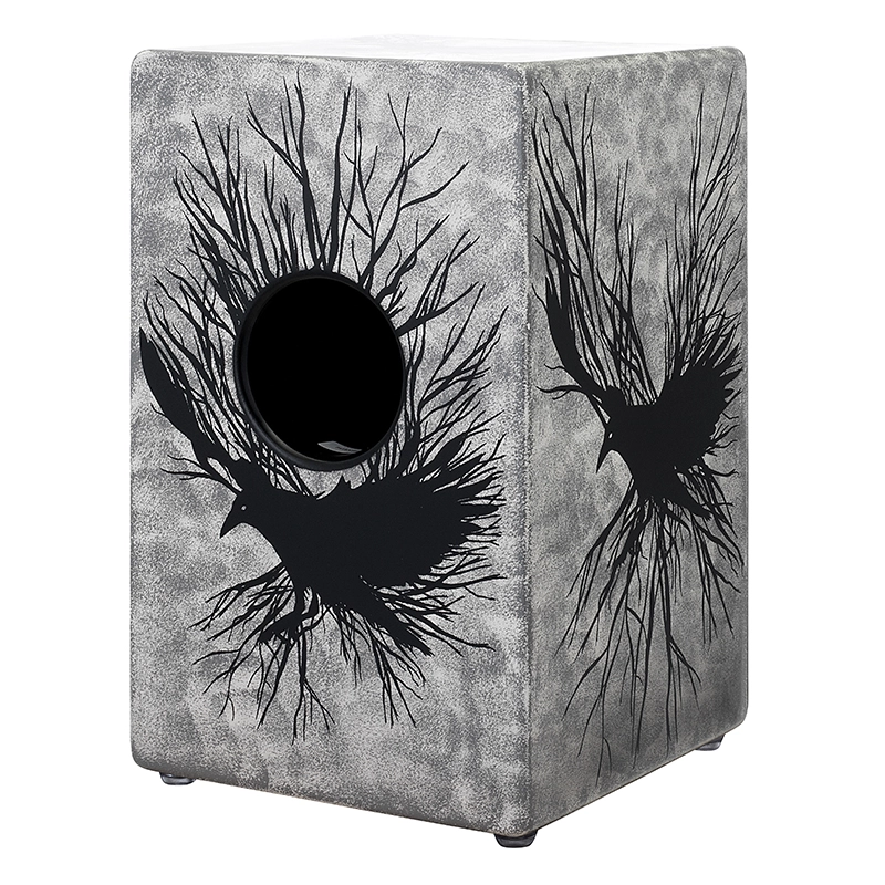 The Raven cajon’s finish is a hand painted and silkscreen design that wraps around 3 sides featuring a stylized black raven.
